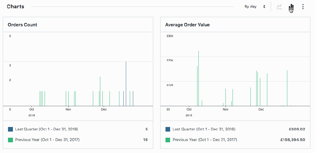 The charts on the dashboard also were updated with some nice new features. Clicking on any of the charts will load the associated report for deeper data analysis. Also you can now select a custom interval for the charts depending on the date range selected.