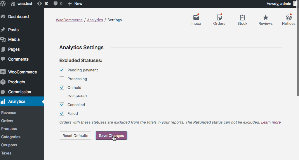 A new Settings section has been added to Analytics. Currently on this screen you can chose which order statuses to exclude from the totals in your reports. Interacting with this form also shows the new Transient Notifications ( aka “toast” style notifs ) system: