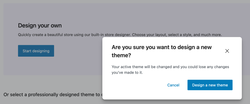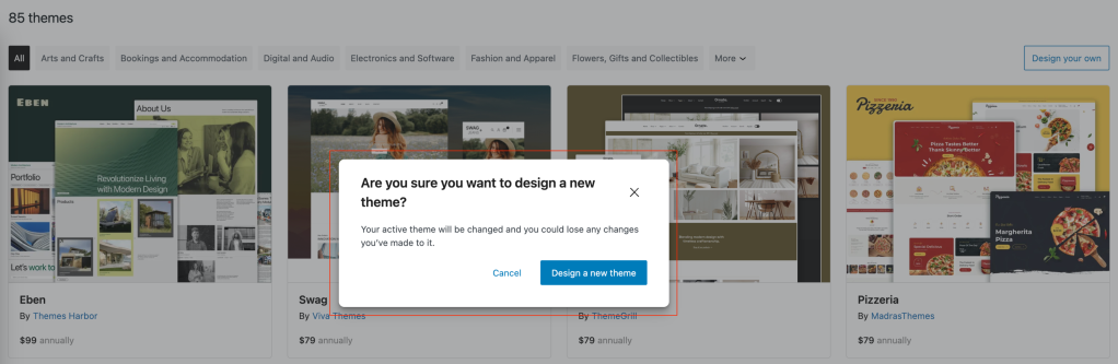 - Add the Design your own section right after the second row of themes. If the currently active theme is TT4, the “Start Designing” button directs users to the assembler; if not, the theme switch warning modal is displayed to confirm the user wants to proceed to the CYS flow and change their current active theme. It is also important to note that the position of the banner is dynamically changed on screen resize to ensure it preserves its expected position in the second row of themes independent of the number of columns displayed:
