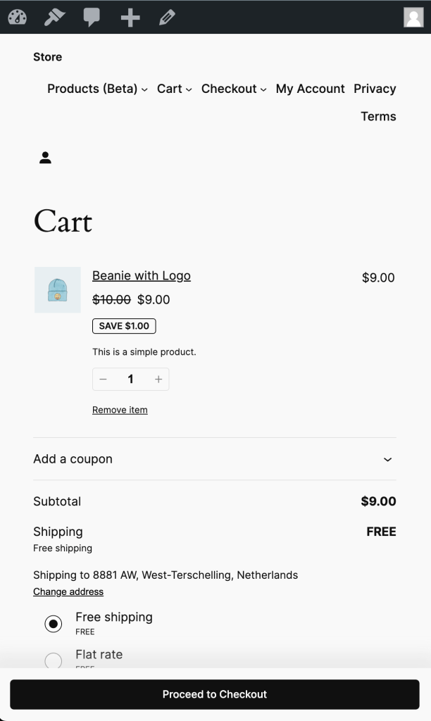 The “Proceed to Checkout” button on the Cart block also remains non-sticky when the screen height is less than 500px and the width is smaller than 782px, preventing it from overlapping product items during high zoom levels.